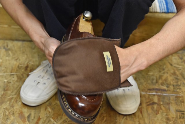 仕上げに、『M.モゥブレイ グローブクロス』で余計なクリームを落としつつ、磨いてあげます。ここでさらにツヤが出て綺麗に仕上がります。