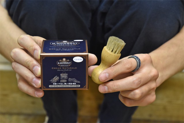 次は栄養クリームで革に栄養を与えます。クリームは複数種類をご用意しているのでお好みで構いませんが、ナチュラルな仕上がりが風合いの良い『M.モゥブレィ プレステージ クリームナチュラーレ ニュートラル』をずっと愛用中。