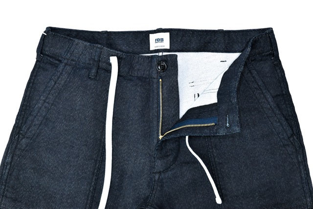 一番の特徴は生地でございます。見た目にも柔らかな素材感ですが、こちらデニムでありながらスウェットのように仕上げたFOBこだわりの生地。