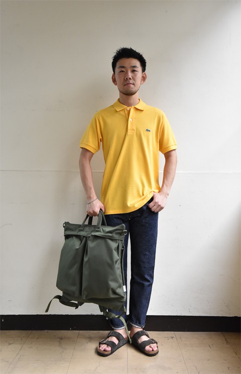 ラコステのポロシャツにリゾルト、そしてヘルメットバッグ。お決まりのゴールデンコンビですね!