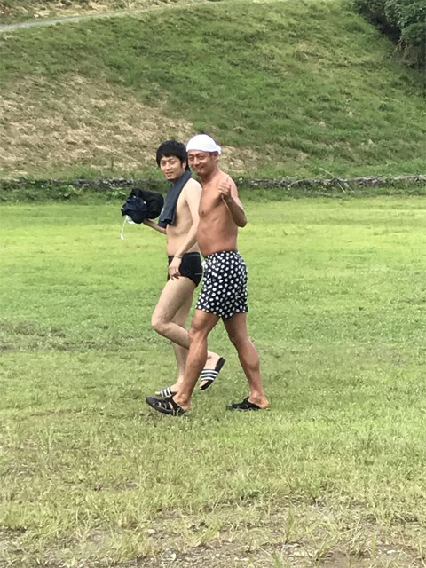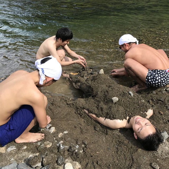 松本さんを砂利で埋めてる様子。瀬川さんの大事なところが僕の頭で隠れて裸に見えます。とにかく明るい瀬川さんです。ヘイッ!!