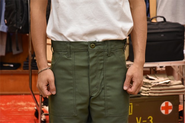 バックサテンと呼ばれる生地で、綿100%。やや薄手の生地感は春から秋にかけて大活躍。僕自身もその期間によく穿いています。今時期の夏場でも裾をロープアップして穿いたりと"サマーロングパンツ"としてもおすすめです!