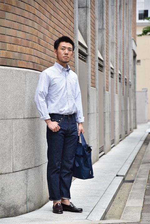 キャンディーストライプのBDシャツに、コインローファーとアメリカナイズながらも今の気分は忘れずに。毛焼きされた712だからスマートな印象。