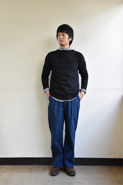 そのウエッソンを使った、"シャツonセントジェームス"もザボスタには欠かせないコーディネイトのひとつです。着方はセーターのようにシャツの上にウエッソンを着るだけ。特徴的なボートネックがシャツと重ねたとき"アクセント"に。