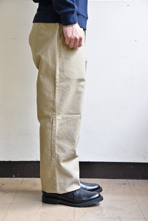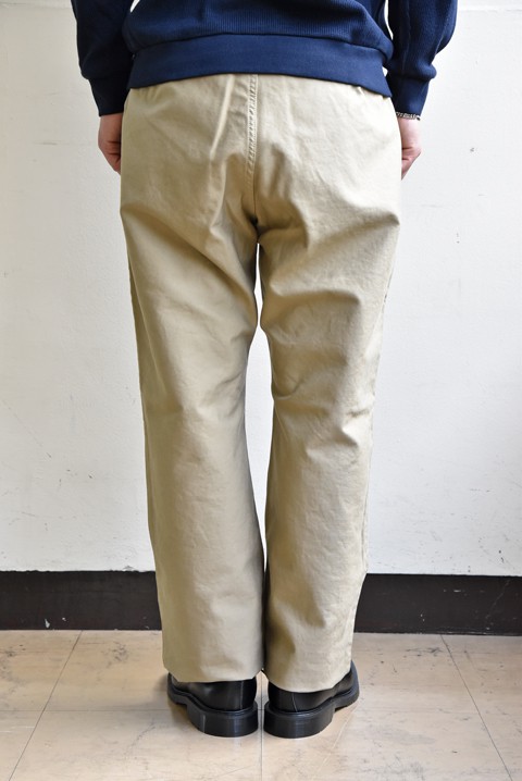 生地はコシのあるバックサテンを採用。GUNG HO(ガンホー)のベイカーパンツなどと同じく穿きこみ洗うたびに、パッカリングなども出ていき、やわらかでアジのある風合いへと変化していきます。後々の穿きこんだ姿が楽しみですね。