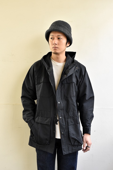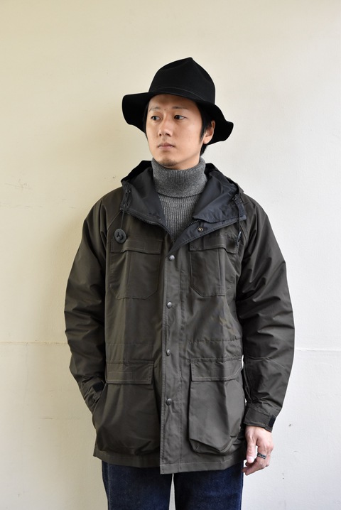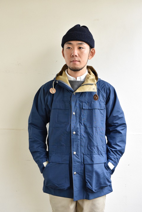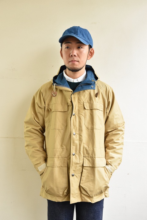 コットンを横糸、ナイロンを縦糸に織り込み、コットン60%、ナイロン40%の黄金の比率で製作された逸品のことで、コットン100%よりもゴワつかず、ナイロン100%よりも摩擦に強く、独特の風合いと光沢を持ち、着るほどに味わいが増す素材のこと。水分を吸うと横糸のコットン糸が膨張して織目を塞ぎ、防水・防風効果を高めます。その素材を用いたマウンテンパーカーがブランドを代表するアイテム。また後に、アウターシェルジャケットの原点となりました。