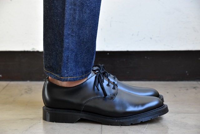 シンプルな4アイレットのデザインに、少し丸みを帯びたカジュアルシューズ。しかし、アッパーのレザーはハイシャイン(鏡面仕上げ)ですので品の良さも残しつつ。このバランスがスタイルを選ばず、使い勝手が良いんです◎