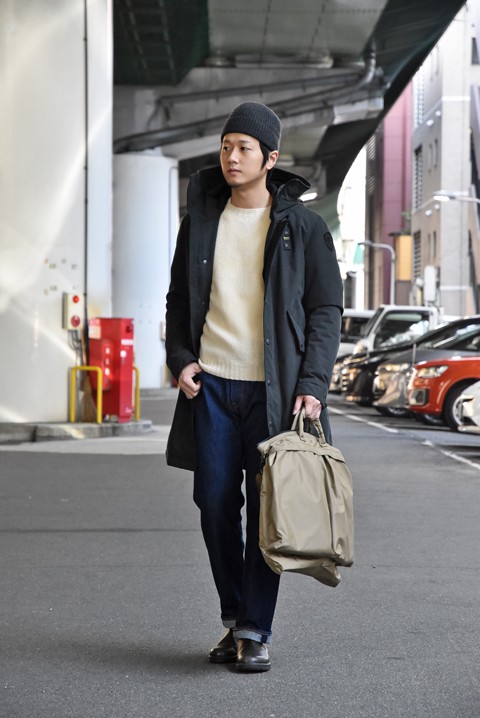 スーツやビジカジなど“オン”の日も、もちろん“オフ”の日にもおすすめなコートです。 素材のロクヨンクロスは防水防風に優れ、中に着るものによって夏以外の幅広い季節に着ていただけるのがいい所。 真冬のロクヨンのお供にはやっぱりウールのセーターです。シンプルなコートなのでクラシックな柄物にもよく合いますよ。合わせられる振り幅の広さもおすすめ出来るポイントですね。