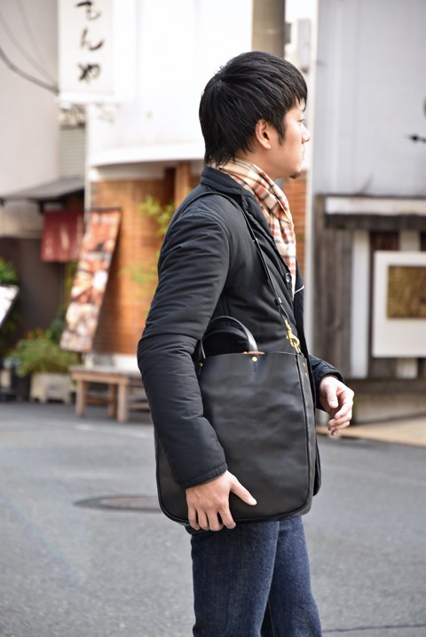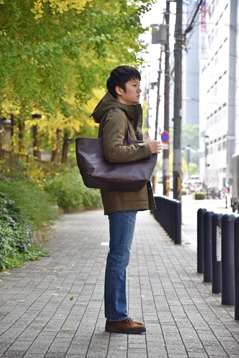 ジャケットやビジネススタイルもおすすめなトートバッグ。2ウェイタイプなので肩掛けもオッケー。