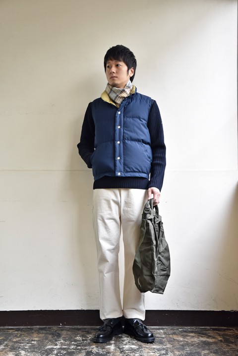 セントジェームス社が実際軍に納品していたアーミーセーターの復刻版。エルボーパッチとダウンベストの組み合わせは◎