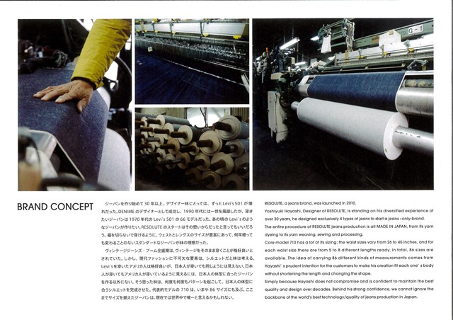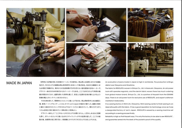 先日NHKのEテレ「美の壺」で「ニッポンのデニム」の特集がありましたね。皆さまご覧になられましたでしょうか。久しぶりに林師匠が出演してはりました。相変わらず言うことが渋いですね!「100人おったら100様のデニムが出来る」(それがジーパンのええところやと。)穿く方の仕事や癖、洗う頻度などでデニムの表情(経年変化の状態)が変わります。師匠が毎週工場へ30年以上通い続けた経験と、糸一本から工場のおばちゃんのお菓子の好みまで知り抜いているからこそ出来るシルエットの美しい、そしての色落ちの綺麗な『RESOLUTE(リゾルト)』が出来上がるのでございます。皆さま慌てず焦らずじっくりとマイリゾルトを育てて参りましょうね。 まだRESOLUTEをお持ちでない初めての方も、ぜひともご試着だけでもなさってみてください。ZABOUではほとんどのサイズを取り揃えてございます。穿き方やお洗濯の方法まで、師匠から教わった方法を伝授させていただきますので、この機会にぜひともご来店くださいませ。もしご遠方の貴兄でもWEB SHOPからご購入頂けます。サイズ選びに迷われたら、ぜひともZABOUまでご一報くださいませ。電話、メールどちらでも構いません。貴兄のサイズ選びのお悩みを解決させていただきます! 先日師匠から頂いた業者向けに作られたカタログが余りにも素晴らしかったので、ぜひとも皆さまでご覧になってくださいませ。