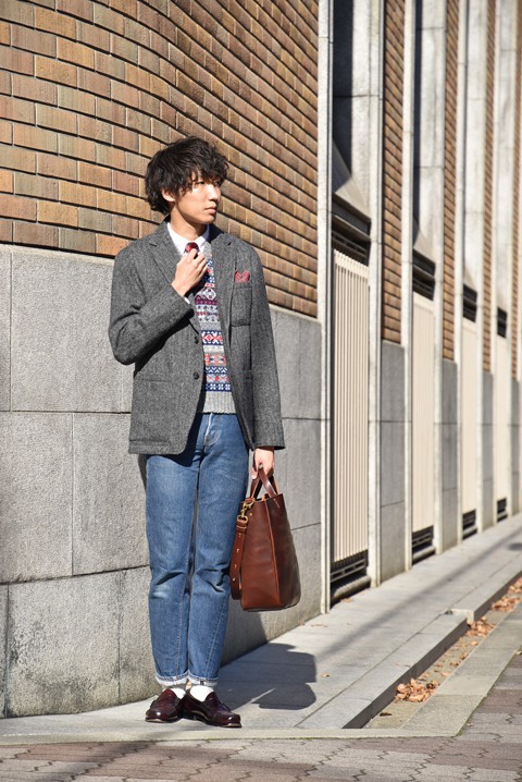 シャツにネクタイのタイドアップスタイルにフェアアイル柄が目を惹くニットベスト、ウールツイード素材のジャケットにハンカチ。仕上げにローファー。