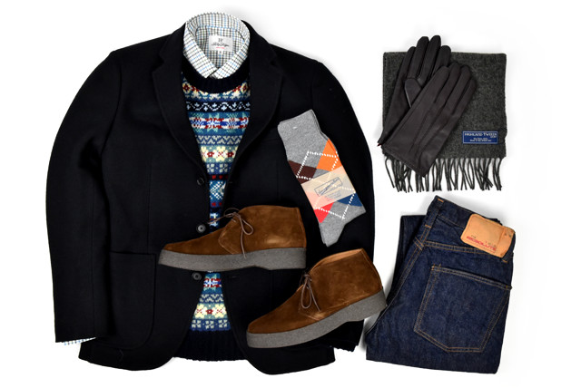710で楽しむ大人のジャケットスタイル、靴のスウェードとフェアアイル柄のセーターでちょっと柔らかい印象に。