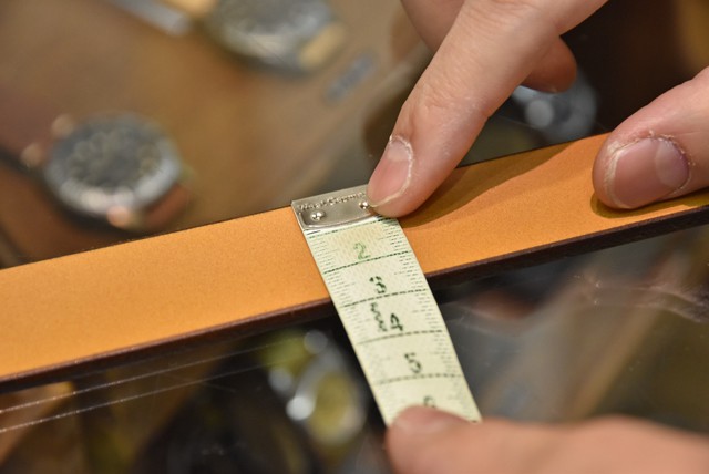 使用していると穴一つ分(約1インチ)は伸びがでます。なので、最初に入った穴より一つ奥の穴に入るくらいにはなります。最初に真ん中の3つ目ぐらいに入るのが丁度良いですが、2つ目でも特に問題ありません。迷った時はご相談を。
