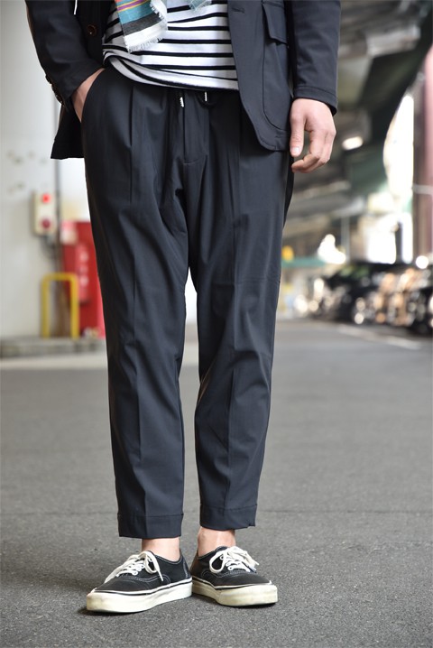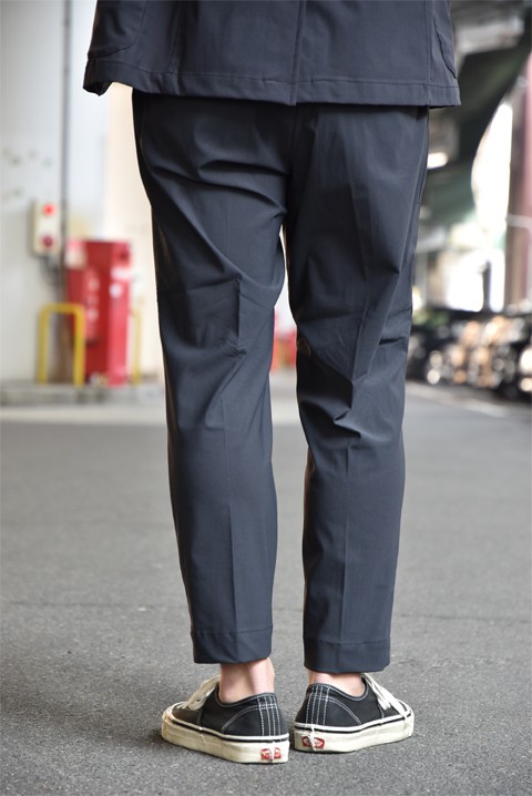 くるぶしが見える短めの丈感で、裾に向かって細くなるテーパードシルエットがスマートな印象◎