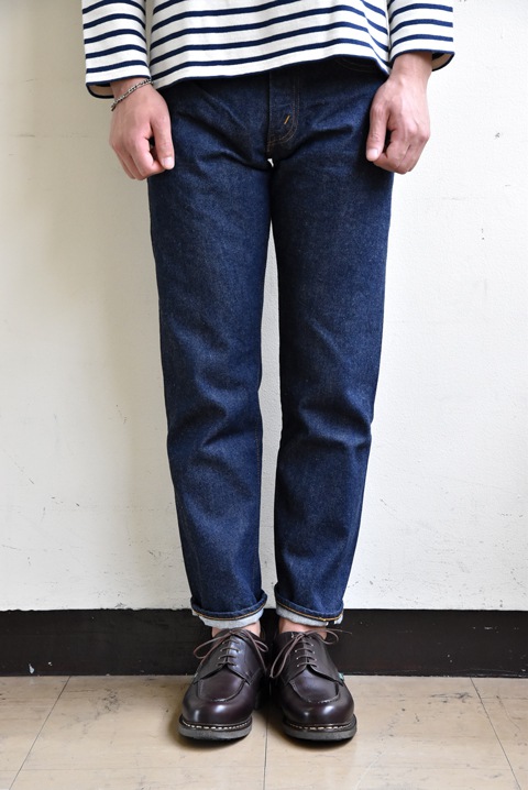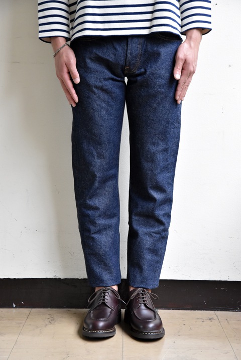 フロントはジッパーフライで膝から下が細くなったテーパードシルエット。リーバイス505モデルよりインスパイア。 710の生地がベースですが、リゾルトデニムの特徴である洗うたびに出る毛をあらかじめ毛焼きし、防縮加工(サンフォライズド)を施しています。色落ちも4品番の中では最も早いモデルです。 レングスは29、31、33の3サイズ展開です。