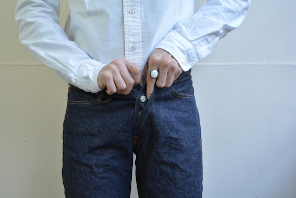 一つ言えるのは、穿き込んで参りますとウエストは“約1インチ”(1インチは約2.54cm)の伸びが見込まれますので、下から順番にボタンを留めて、一番上のボタンを留めた時にキツイくらいが、後に伸びて丁度良いサイズとなります。