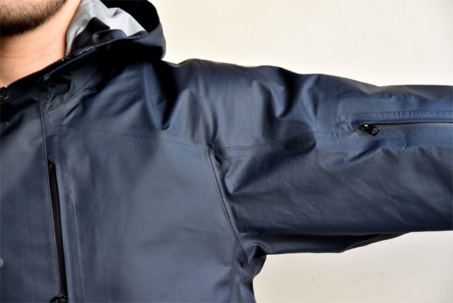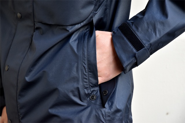 大きめのハンドポケットで、蓋止めにハンティングジャケットのディティールを採用しています。袖口にもひと工夫。