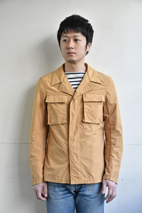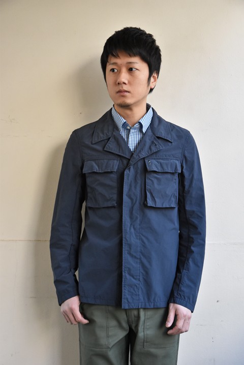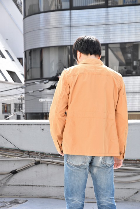 マイクロファイバー糸を使用し、高収縮加工を施していますので密度の高い生地に。独特な硬さとコシがあって随所に見られるパッカリングが立体的で良い雰囲気です。撥水性もあって少々の雨なら問題なく着て頂けますよ。