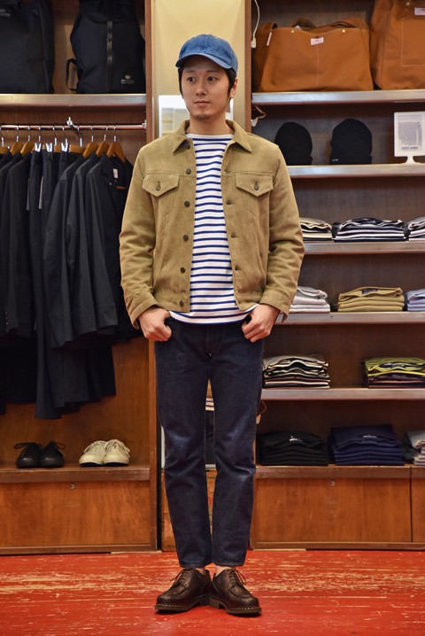 某名作ジャケット。おなじみの形ですが特徴的な素材や綺麗な色目で違う魅力がたっぷり詰まってます。ジーパンもいいですが、チノトラウザーで合わせるのもいいですね。
