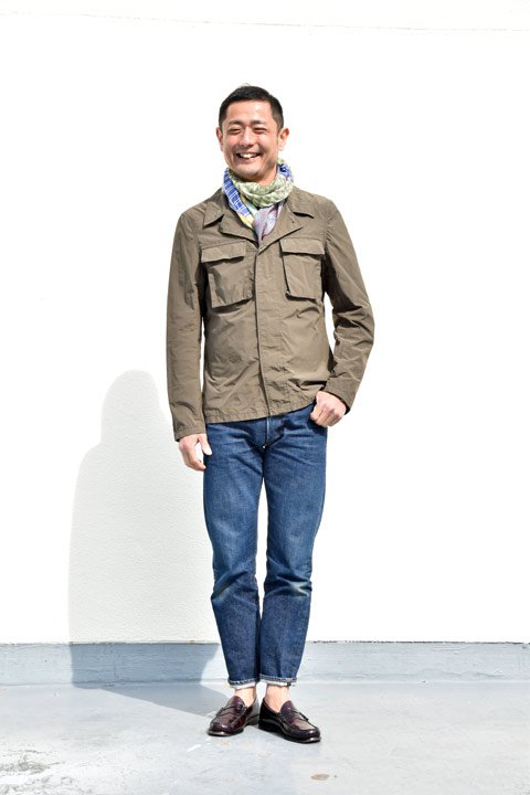 これはもう間違いなくRESOLUTE710とコーディネイトをして貰うのが宜しいかと存じます。ミリタリーシャツとGパン、最高の組み合わせではないでしょうか。今回のポイントはストールでございます。春先にはまだまだ肌寒い日がございます。そんな時はそっとエスニックな雰囲気漂う巻き物が、貴兄の気分を上げてくれること間違いなし!でございます。おっと!忘れちゃいけねえ。足元はローファーでまとめてみてくださいませ~。