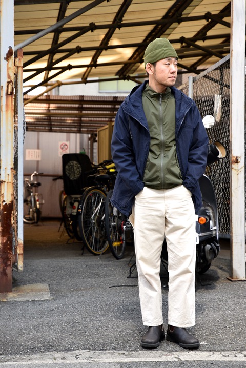 『コットン素材の春アウターのインナーに、ナイロンもの。おすすめのレイヤードです。』