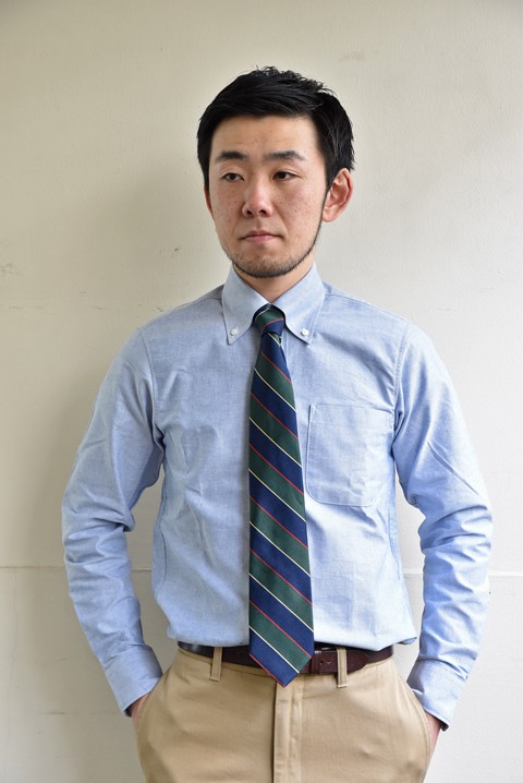 そこにオックスフォードのBDシャツにシルクタイ。合わせるパンツはシルエットの良いチノトラウザーが入りやすくておすすめです。