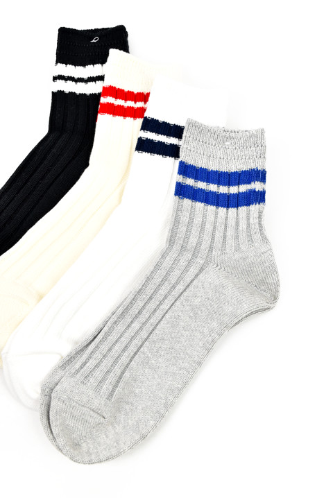 シンプルなライン入り靴下は、チラッと見えるときのアクセントに。
