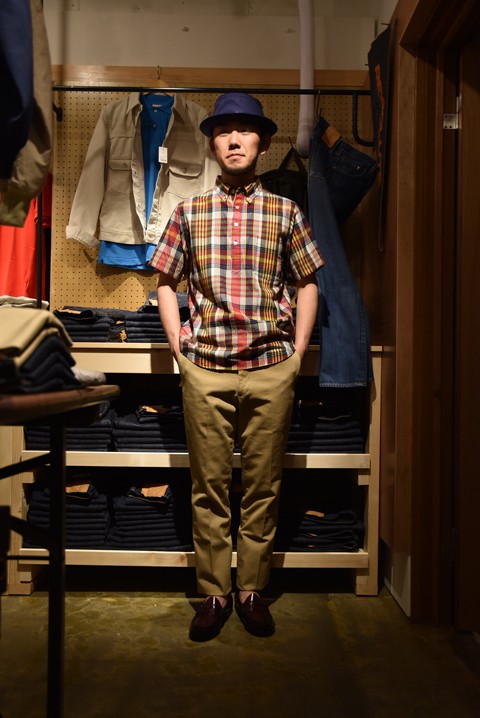 色鮮やかな半袖マドラスシャツに、コインローファーを合わせたアイビースタイル。