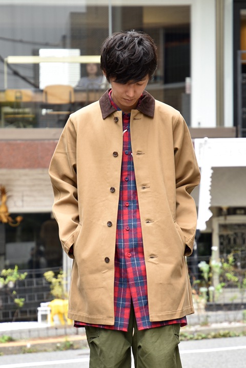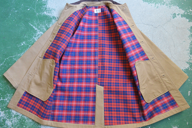 衿にコーデュロイ、身頃内側にチェック生地をボンディングした、着るほどに味わいの深まるステンカラーコート。