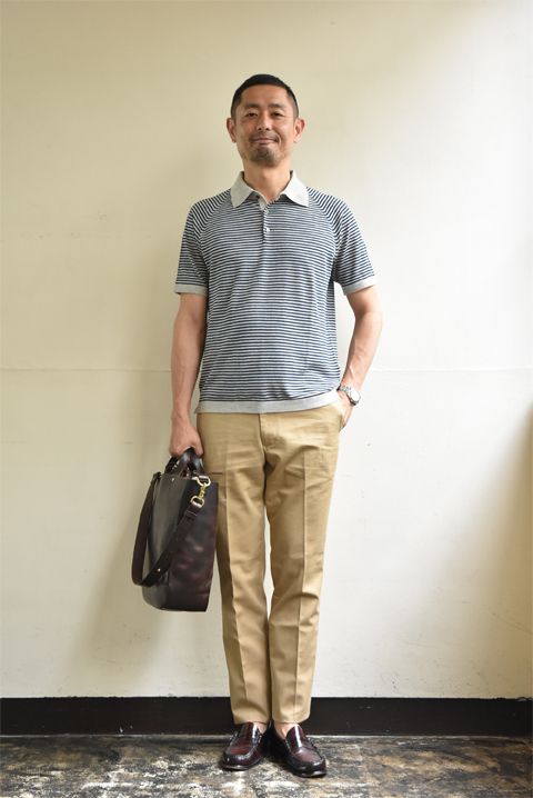 プリントTシャツに食傷気味のお父さん!夏バテにはニットTシャツで暑い夏を乗り切りましょう。子供っぽいTシャツを着るよりも縞柄のニットTシャツを普段着のGパンと合わせるだけで、貴方さまの品格がUPすること間違いナシ!でございます。