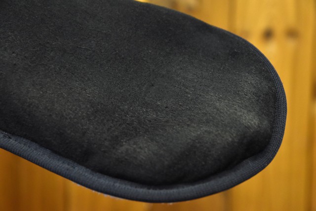 ふんわりとしたボア状のマイクロフリース(ポリエステル)面と、エゾジカのスウェード面で作られた2WAYタイプ。
