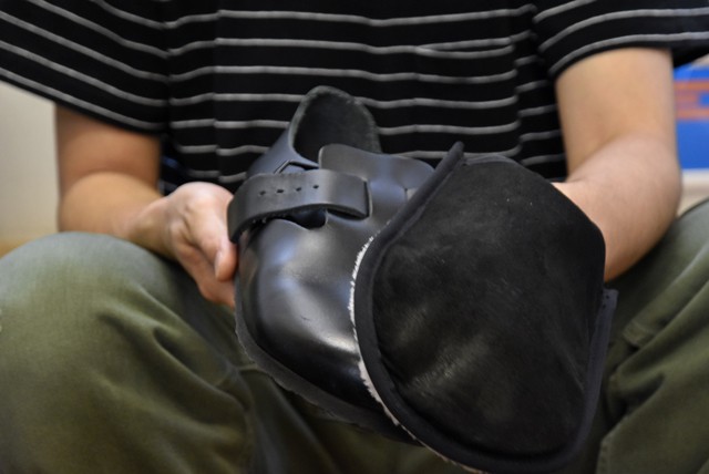片方をエゾ鹿ちゃんで拭いてみました。少し分かり辛いですが、ツヤ感が増しています。ちなみに事前に他のお手入れはしていません。