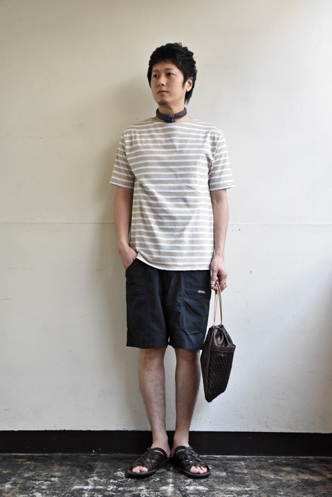 と言うのも、ピリアックはボートネックと独特の生地の光沢感で上品さが◎、ラフな印象のナイロン素材のパンツの合わせると非常にバランスが良い!