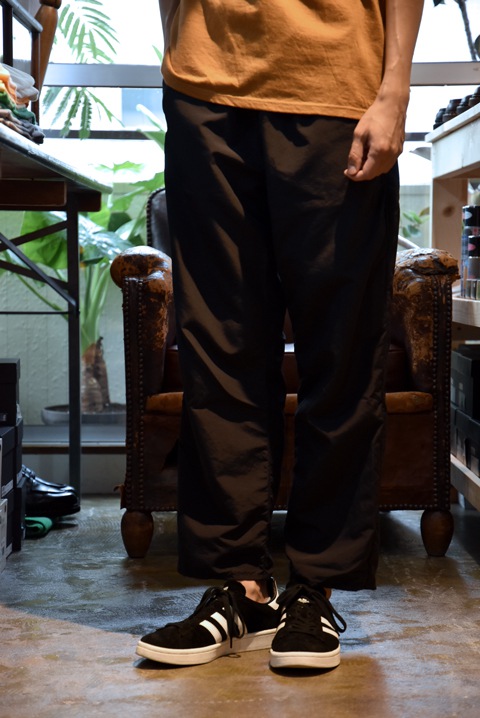 ●N.O.UN(ナウン) SPINDLE PANTS 'RIP' ブラック ナイロンパンツをストリートな雰囲気で穿くのが今年の気分! ナウンのこれは、ゆるいテーパードの効いたリラックスシルエットと素材感の組み合わせが絶妙です。 真夏でも快適な軽い穿き心地で真夏でも重宝します。 丈はくるぶし丈に裾上げして、スニーカーと合わせてストリートに合わせたいところです。
