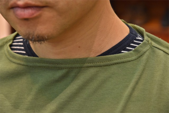 特にシャツなどでレーヨン素材やリネン素材の物(吸水性の高い素材)を着用する際には、シャツ1枚で着るよりもインナーにタンクトップを着ていただくと汗染みなども軽減されて、よりレーヨン、リネンの素材感をキープしやすいと思います。あと、ポロシャツのインナーにもゴワつかなくておすすめですよ。