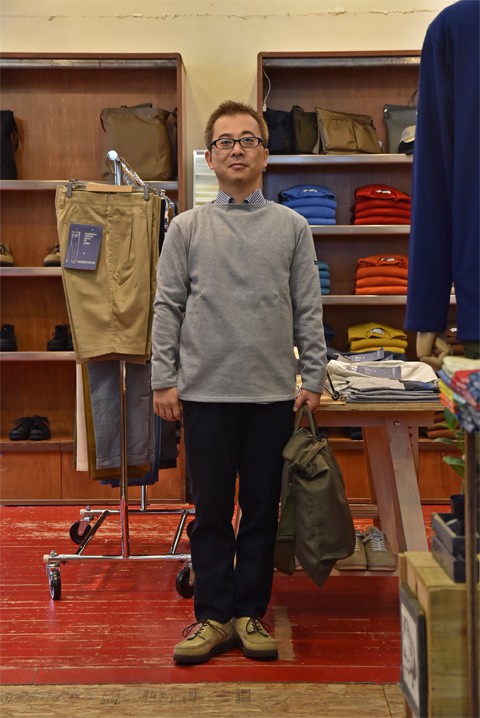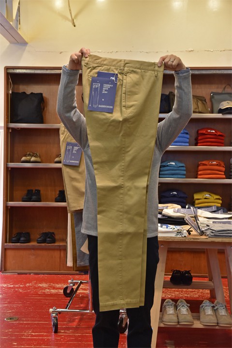 シンプルイズベストとでも申しましょうか、形はテーパードを効かせ、ラインにこだわった美しいシルエットのノータックチノパン。私は、ZABOU定番アイテムでカジュアルに合わせてみました。