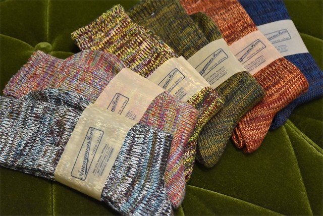 無地ソックスも良しでは有りますが、先日入荷して参りました、アノニマスイズムの柄ソックスなんかと合わせてみてもいいのではないでしょうか。