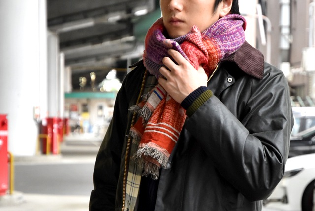 こちらはシンプルにマフラー巻き。Barbour(バブアー)やBARACUTA(バラクータ)のG10など、丈のあるアウターとの相性も抜群です。