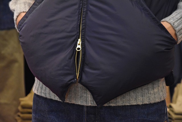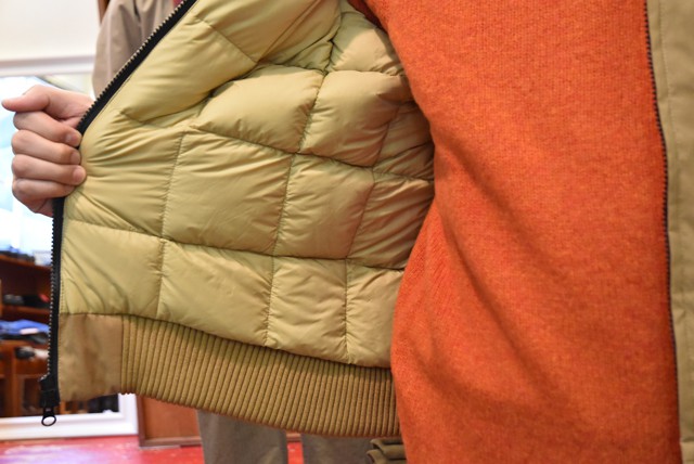 こちらは表地、裏地共にストリークフリーナイロンと呼ばれるナイロンを使用しています。上質なこちらのナイロンは、発色が良く、肌すべりの良さも心地良い。また、着ているとすぐにじんわりと暖かくなる熱伝導性の高さがございます。