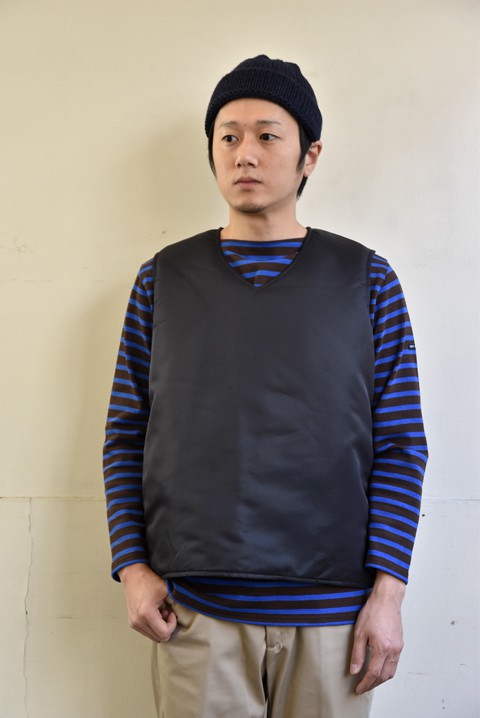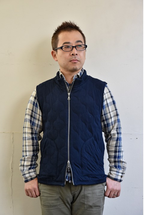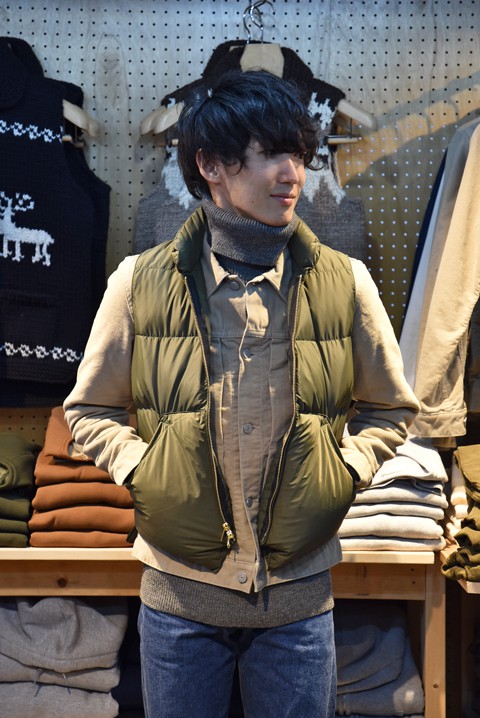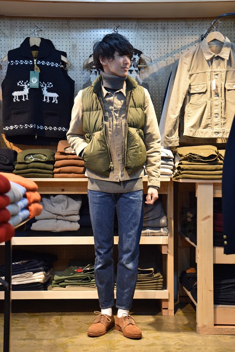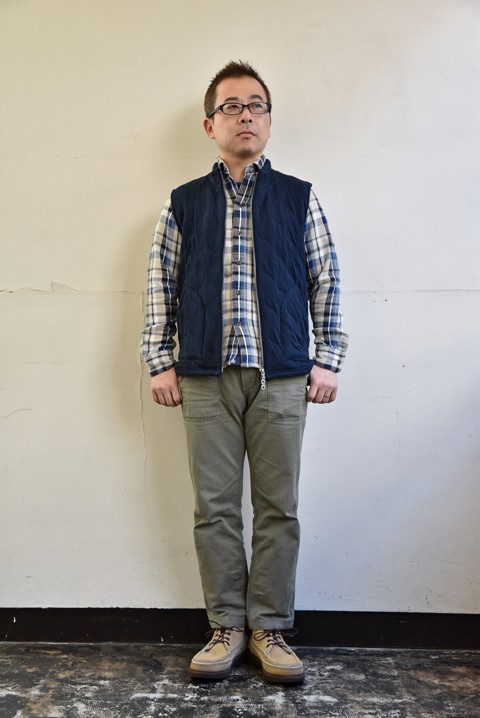 かわいいベスト、いやチョッキと呼ぶ方がしっくりくるか。どっちも同じですが。 独特な形ですが、着ているとこれが結構クセになるんです。少しヌけた雰囲気がお気に入り。 まずはインナーにウェッソンを着て楽しんでます。中綿入りでボリューム感も丁度良いので寒くなればインナー使いしてやろうと企んでます。 ●帽子 HIGHLAND2000(ハイランド2000)  ¥4,860- ●ベスト N.O.UN(ナウン)  サイズ:L  ¥22,680- ●カットソー Saint James(セントジェームス)  サイズ:5  ¥10,800- ●パンツ N.O.UN(ナウン)  サイズ:32  ¥13,824- ●シューズ BLUNDSTONE(ブランドストーン)  サイズ:8  ¥27,000- ●バッグ N.O.UN(ナウン)  ¥7,020- 身長175cm 体重65kg 足のサイズ約26.5cm
