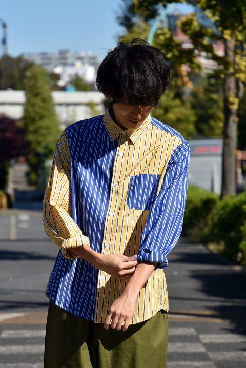 ぱっと目を引くクレイジーパターンのストライプシャツ。色合わせが抜群でヒトメボレ。 クレイジーで一見派手ですが、コシのある生地感と小さめの襟元、小ぶりのボタンが何とも言えない上品さを漂わせており着やすさも◎。こういうシャツを、サイズアップでラフに着こなすのが気分ですね~。 1枚でも重宝しますが、今回のコーディネートのように重ね着をしたときの表情がとっても好きです。