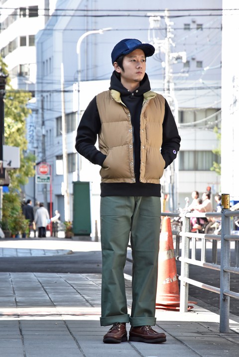 ●帽子 SUBLiME(サブライム)  ¥3,888- ●ベスト Crescent Down Works(クレセントダウンワークス)  サイズ:S  ¥43,200- ●スウェット Champion(チャンピオン)  サイズ:L  ¥18,144- ●パンツ GUNG HO(ガンホー)  サイズ:32  ¥8,964- ●シューズ RussellMoccasin(ラッセルモカシン)  サイズ:8  ¥64,800- 身長175cm 体重65kg 足のサイズ約26.5cm ガンホーらしいストレートのシルエット。これぞザボスタの定番で、まずおすすめしたい一本です。 やや太めのシルエットですが、腰回りがすっきりしていますので太いながらも綺麗なシルエットが◎ アメカジっぽいコーディネイトはもちろんですが、ジャケットやレザーシューズを合わせてもよく似合いますよ。