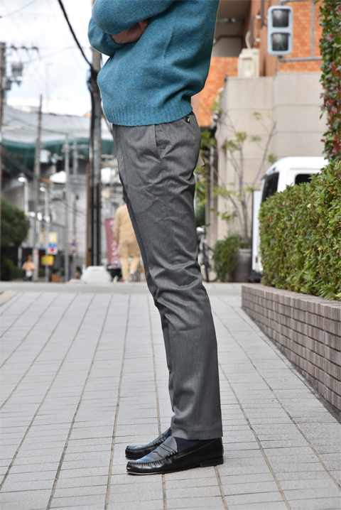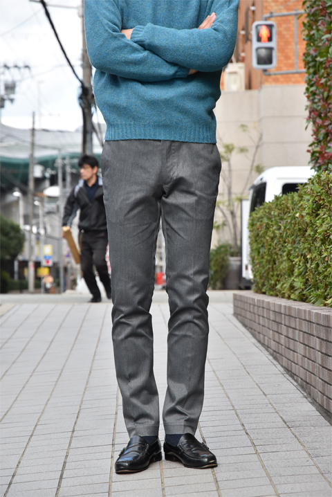 コットンポリの素材にポリウレタンが入ってストレッチが効いた素材でございます。 ツータック、ノータックに比べるとやや細め。 生地感も光沢が強くオンオフ両方で活躍してくれる一本です。 カーキとグレーの2カラー展開です。