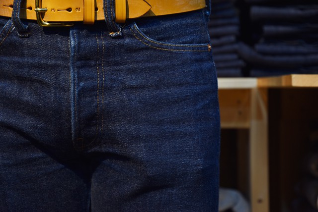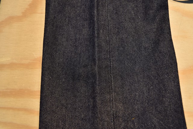 ワンウォッシュデニムですが、初めに裏返してお洗濯すると畳みジワがとれます。初めから表向きで洗ってしまうと、その畳みジワのところまで色落ちし、残ったままになってしまいます。そうなるともう手遅れ。これは知らなかったという人も多いかと。