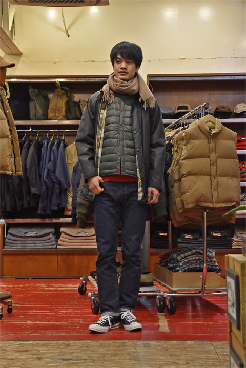 バブアーのオイルドジャケットの質感とインナーダウンのナイロンの質感のコントラストが相性◎。