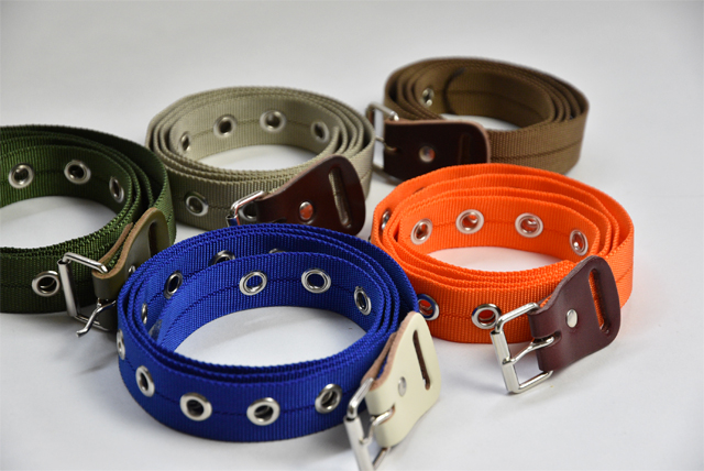 カラーバリエーション豊富なナイロンベルト。工業用のロープを、特殊で非常に手間のかかる手法で染めています。