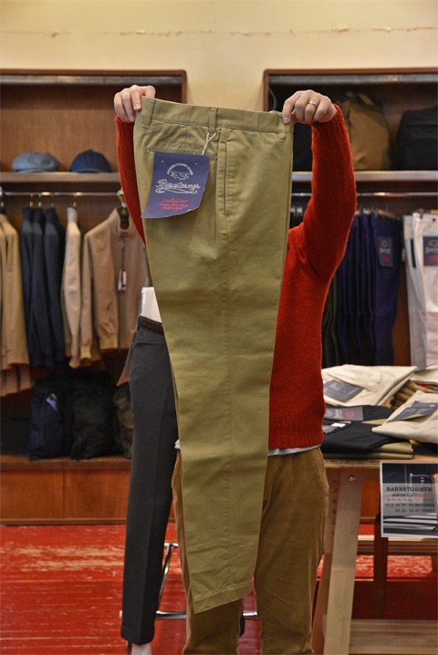 ZABOUで、定番として取り扱っております型番1001PのBARNSTORMER(バーンストーマー) ノータックチノパンツ<カラーカーキとネイビーのみ定番展開です>。いたってシンプルではありますが、生地選びから縫製まで全て日本製の確かな作り。そして抜群のシルエットの良さ。これらを一番実感していただけるのは、こちらのパンツになるんではないでしょうか。