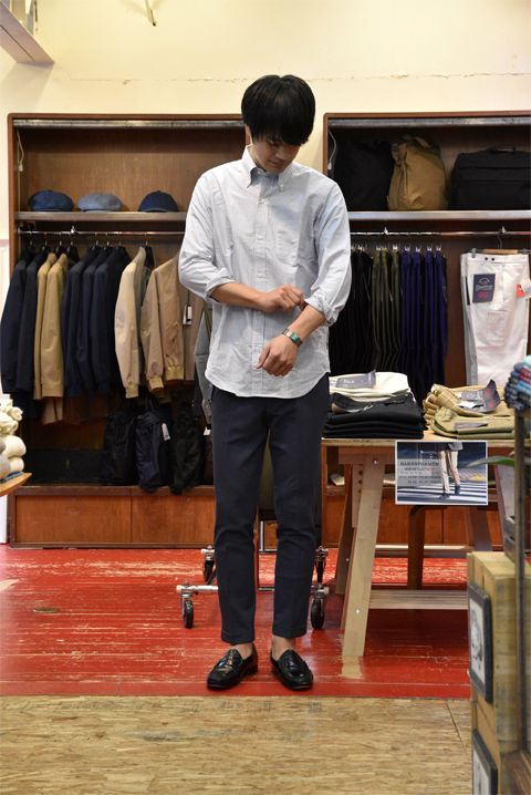 シャツはタックインせず袖は捲ってちょっと西海岸をイメージしたラフなスタイル。