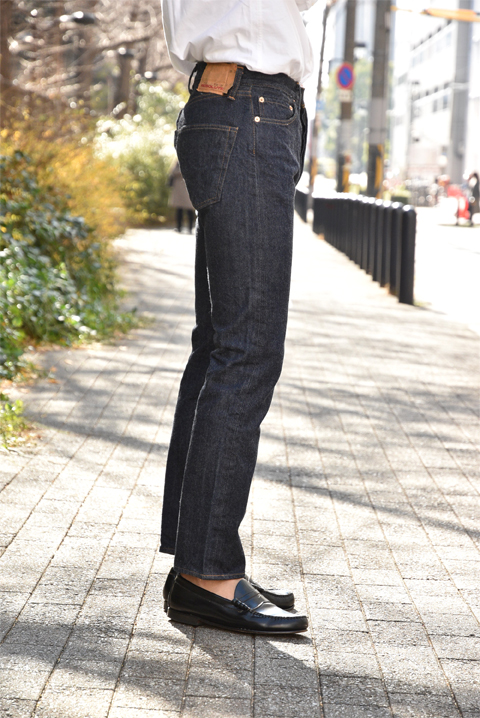 710のローライズモデル。すっきりとした腰回りは女性にもおすすめのモデルです。 股上が浅いぶんフロントボタンは4つ。レングスは34のみの1サイズ展開です。